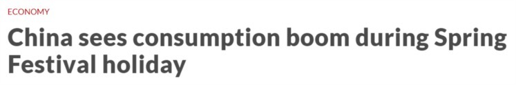 马来西亚《星报》23日报道称,在创纪录的9天春节假期期间,中国各领域消费活动强劲,这为世界第二大经济体巩固复苏势头传递了积极信号,也彰显了消费者信心。