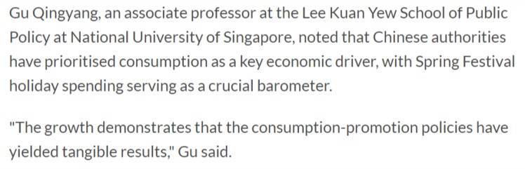 r报道援引新加坡国立大学李光耀公共政策学院副教授顾清扬的话表示,中国政府已将消费列为关键的经济驱动力,春节假期消费则成为重要晴雨表。“增长表明促消费政策已取得切实成效。”