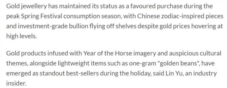 r报道还称,黄金珠宝在春节消费旺季持续保持热门购买地位,尽管金价处于高位,但生肖主题设计的黄金饰品和投资级金条依然畅销。报道援引业内人士的话称,融入马年元素和吉祥文化主题的黄金产品,以及如一克“金豆”等质量较轻的产品,在节日期间成为最畅销的品类。