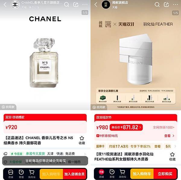 近年来,高端市场虽有国际品牌强势主导但仍跑出了观夏、闻献和Melt Season等定位高端的国货香水品牌,产品每毫升单价甚至高于国际品牌。以香奈儿5号香水为参考,天猫旗舰店中香奈儿5号35ml香水售价920元,每毫升单价26.28元,而闻献羽化仙30ml香水售价980元,每毫升单价32.66元。