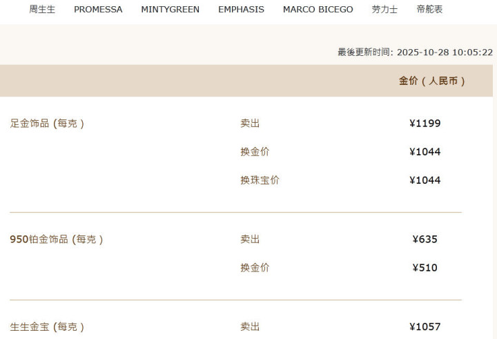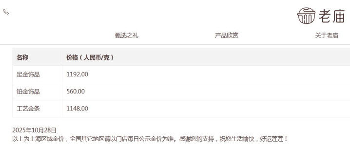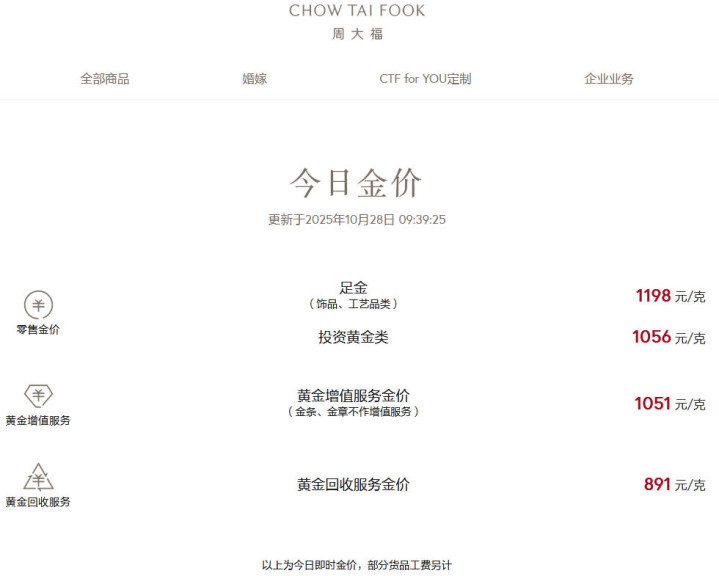 中新经纬注意到,目前,周大福足金(饰品、工艺品类)价格为1198元/克,周生生足金饰品价格为1199元/克,老庙足金饰品价格为1192元/克,潮宏基足金(首饰摆件)价格为1223元/克,老凤祥足金零售价为1202元/克。